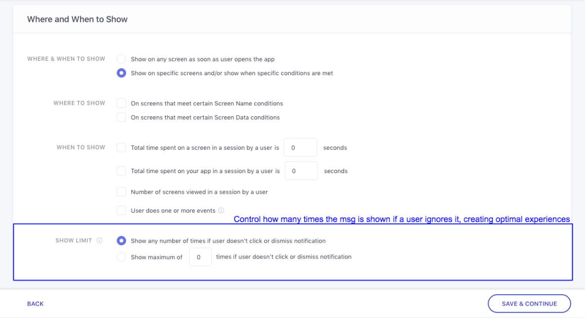 Step 2: Specify When to Show, Which Screen to Show on & How Many Times to Show
