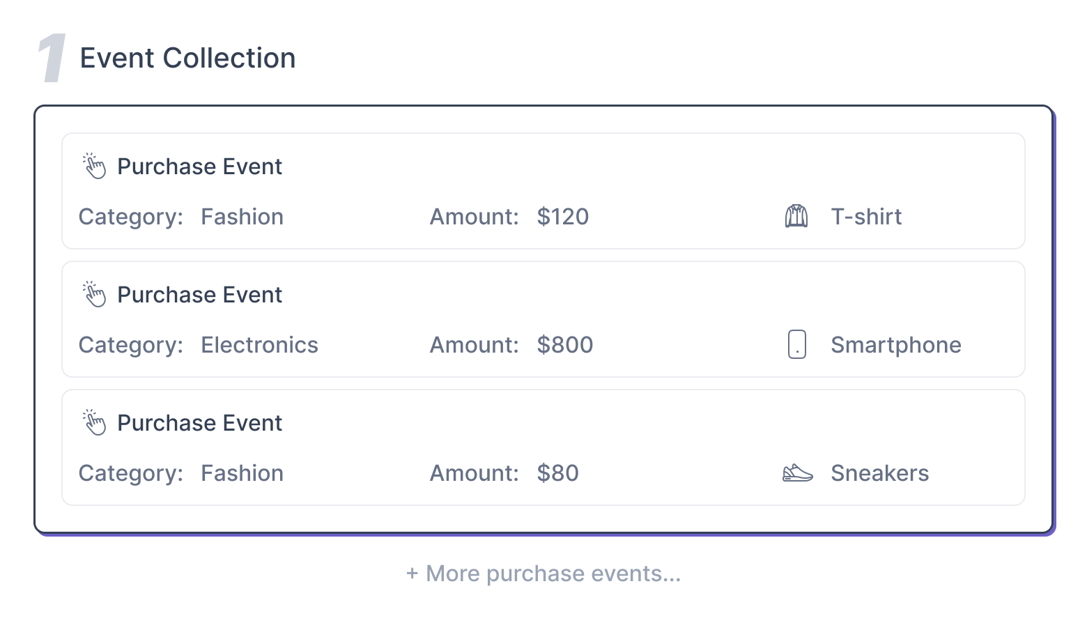 The system collects all Purchase Events made by a user. Each event contains details such as: