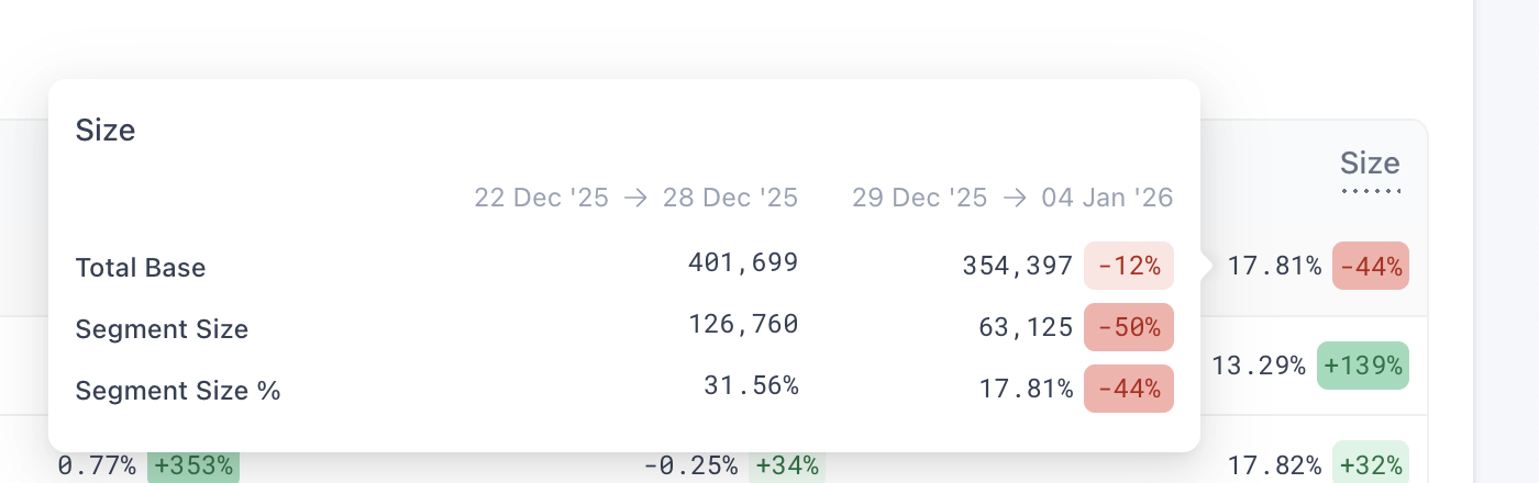 Size Tooltip: Hovering here reveals the Total Base (total account volume) vs. Segment Size (driver volume) and the resulting Size %.