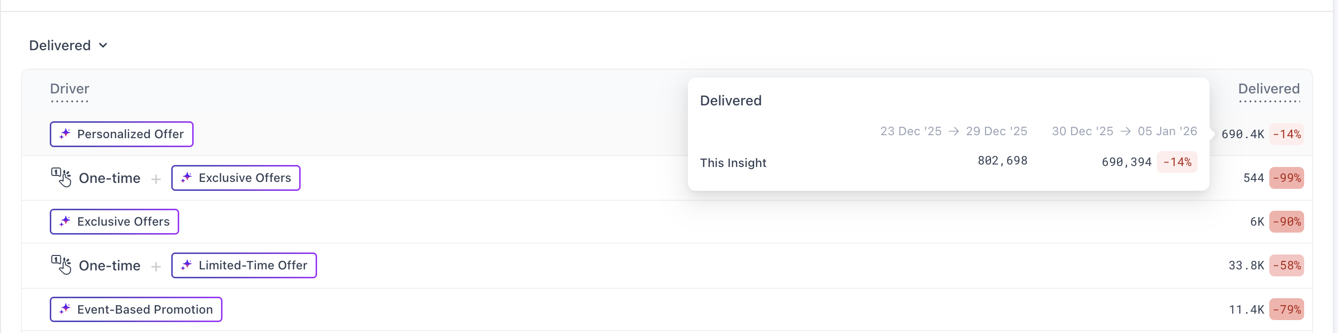 For absolute metrics like Delivered, Clicks, Conversions, or Revenue, the dashboard focuses on raw volume trends. You can still hover over any driver to see its specific performance breakdown, including the Current Value, the Previous Value from the last 7-day cycle, and the exact Difference between the two.