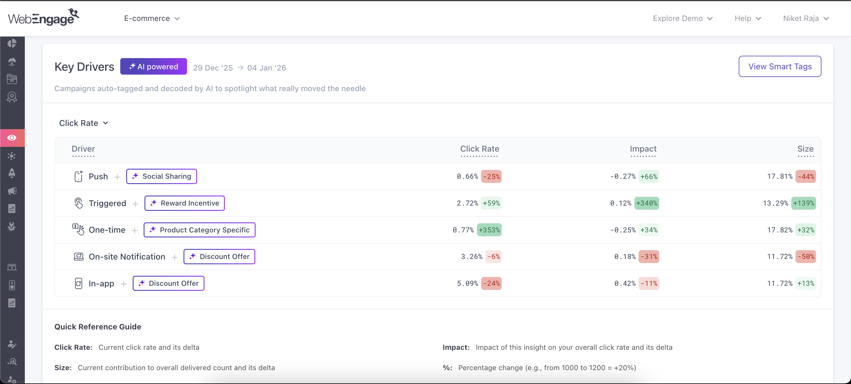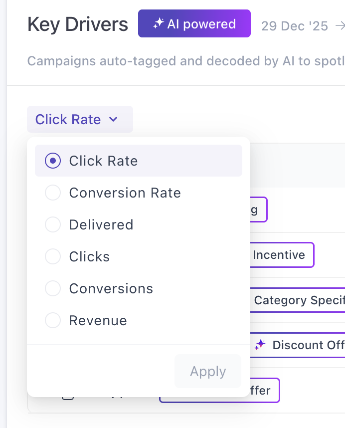 The Key Drivers feature acts as your weekly strategic advisor, using artificial intelligence to identify exactly what moved the needle on your engagement metrics. By automatically decoding your campaign copy into Smart Tags, this tool decouples "how" you sent a message (the channel) from "what" the message actually said (the content).