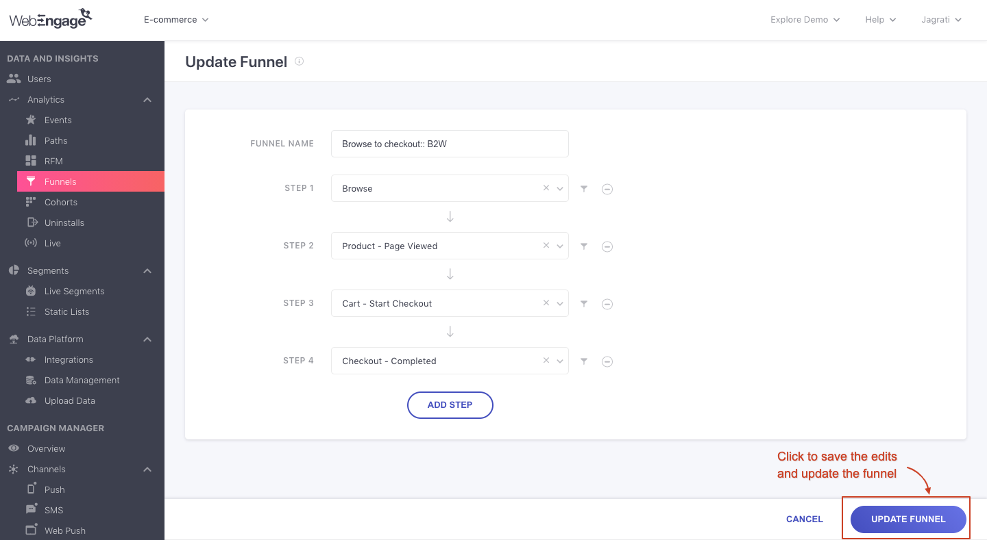 Thus, we can simply create funnel 1 and duplicate it to the accommodate the variation in event attributes of the fifth step; Checkout - Payment Added. This way we will have the following funnels in half the time.