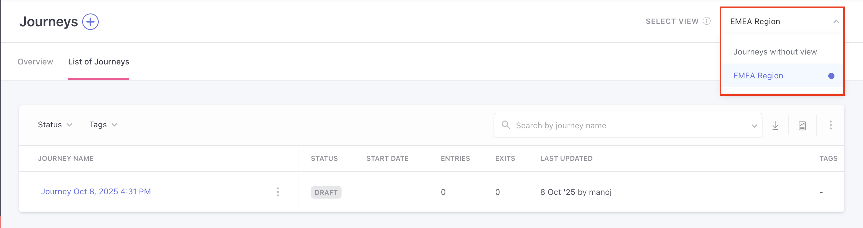 When a user creates a journey within an assigned view, it automatically inherits an implicit filter that matches the view’s criteria. This ensures all journeys remain aligned with predefined rules and restrictions.