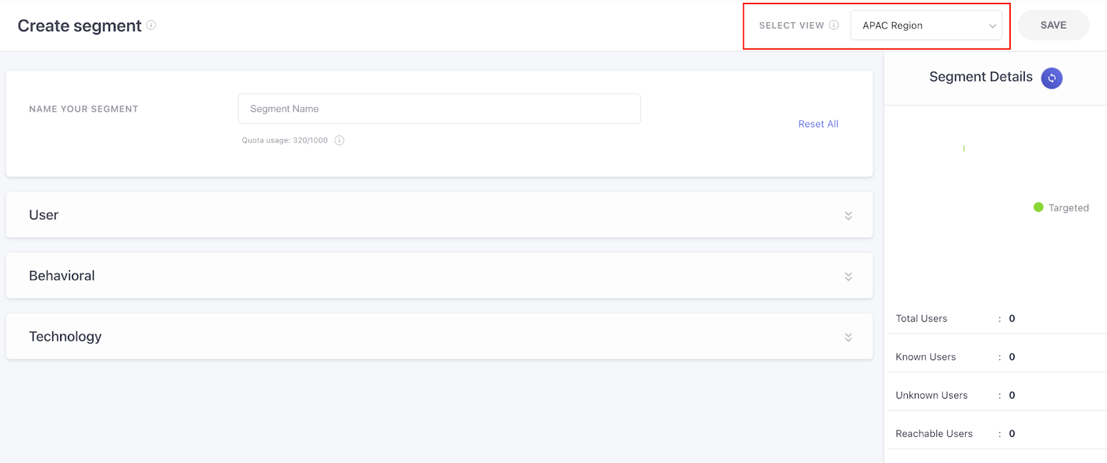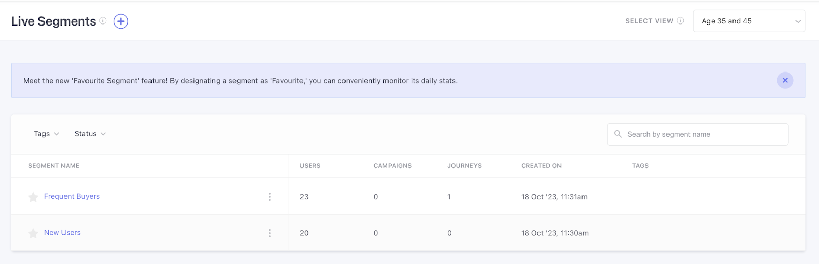 The Segment Listing Page displays all segments created within the views assigned to a user. Since users can be associated with multiple views, the page includes an option to switch between views to explore different segment sets.