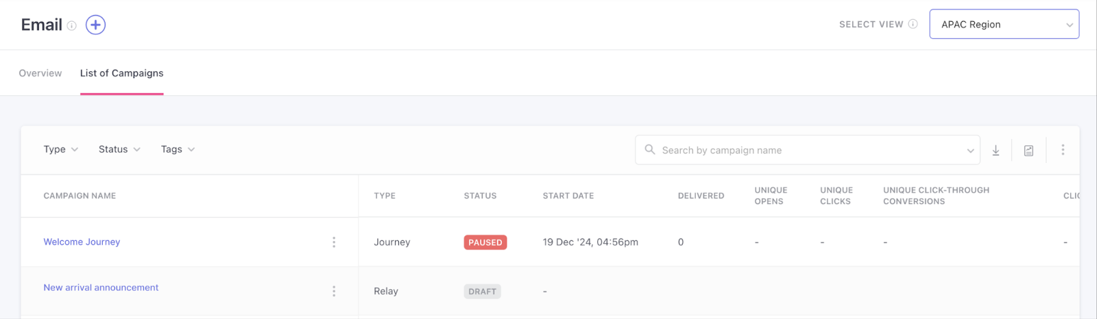 The Campaign Listing Page displays all campaigns created within the views assigned to a user. Since users can be associated with multiple views, they can switch between views to explore different campaign sets.