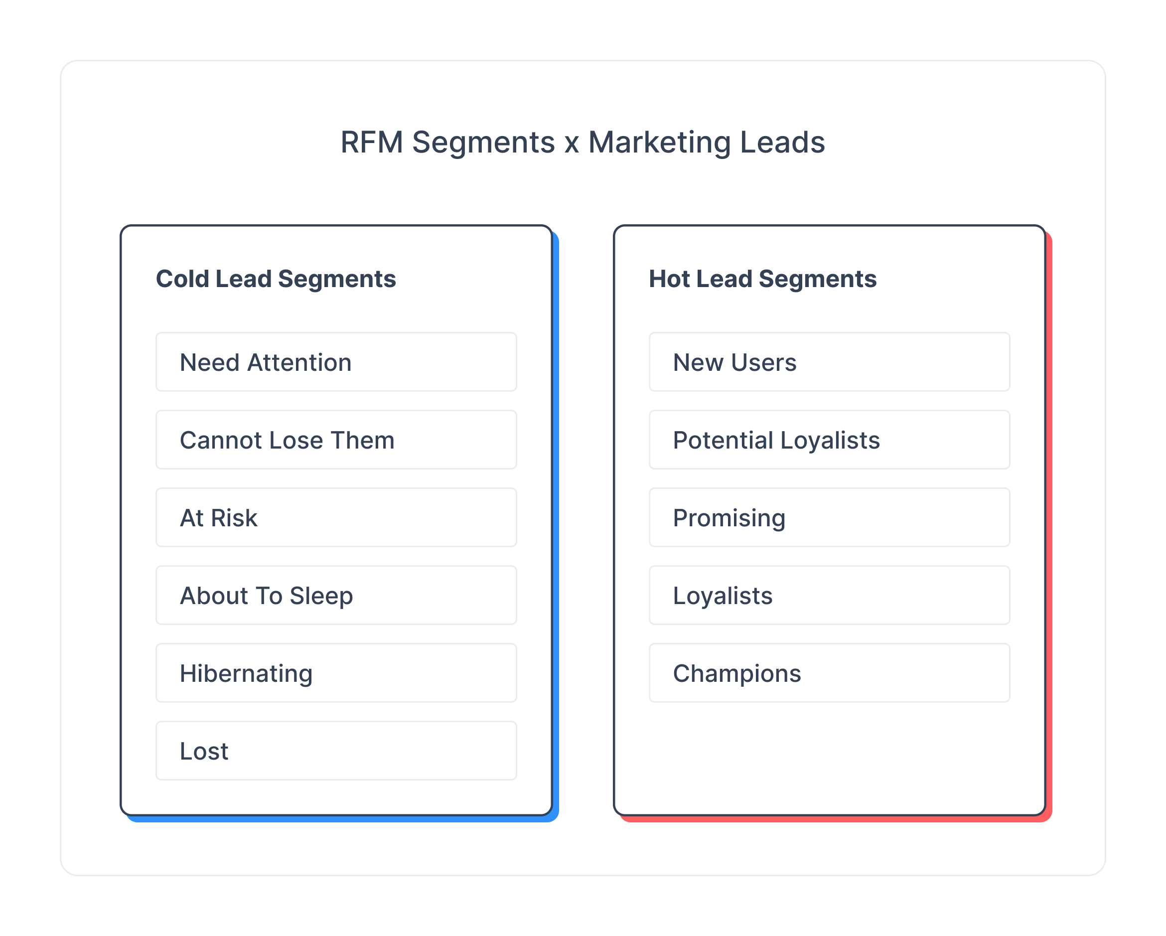 When predicting RFM segments, users with the highest score are grouped into Hot Lead Segments (brand champions, potential loyalists), and vice versa. Hot Segments broadly indicate highly engaged users who have a promising affinity towards your brand and are very likely to become long-term customers. These are low-hanging fruits that you can easily leverage to drive those revenue metrics! (Detailed read)