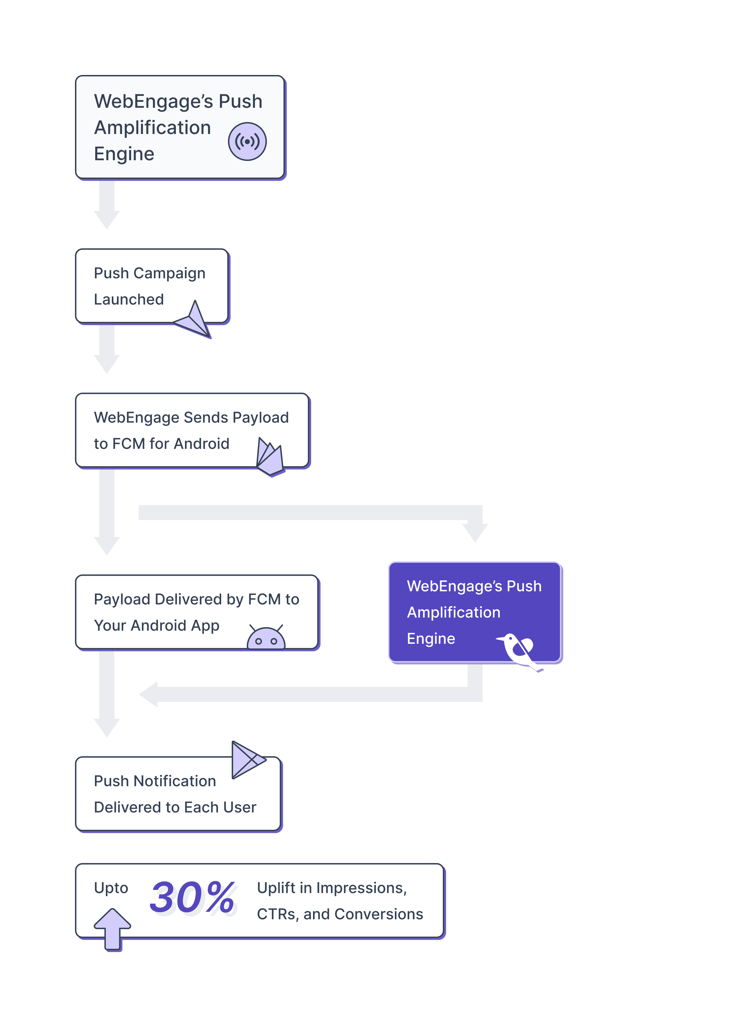 This device-level optimization creates a barrier between you and your users. This is why, we built our Amplification Engine. It's a smart delivery system that identifies the notifications FCM was unable to deliver and reattempts delivery on app launch - helping you effectively engage a wider audience.